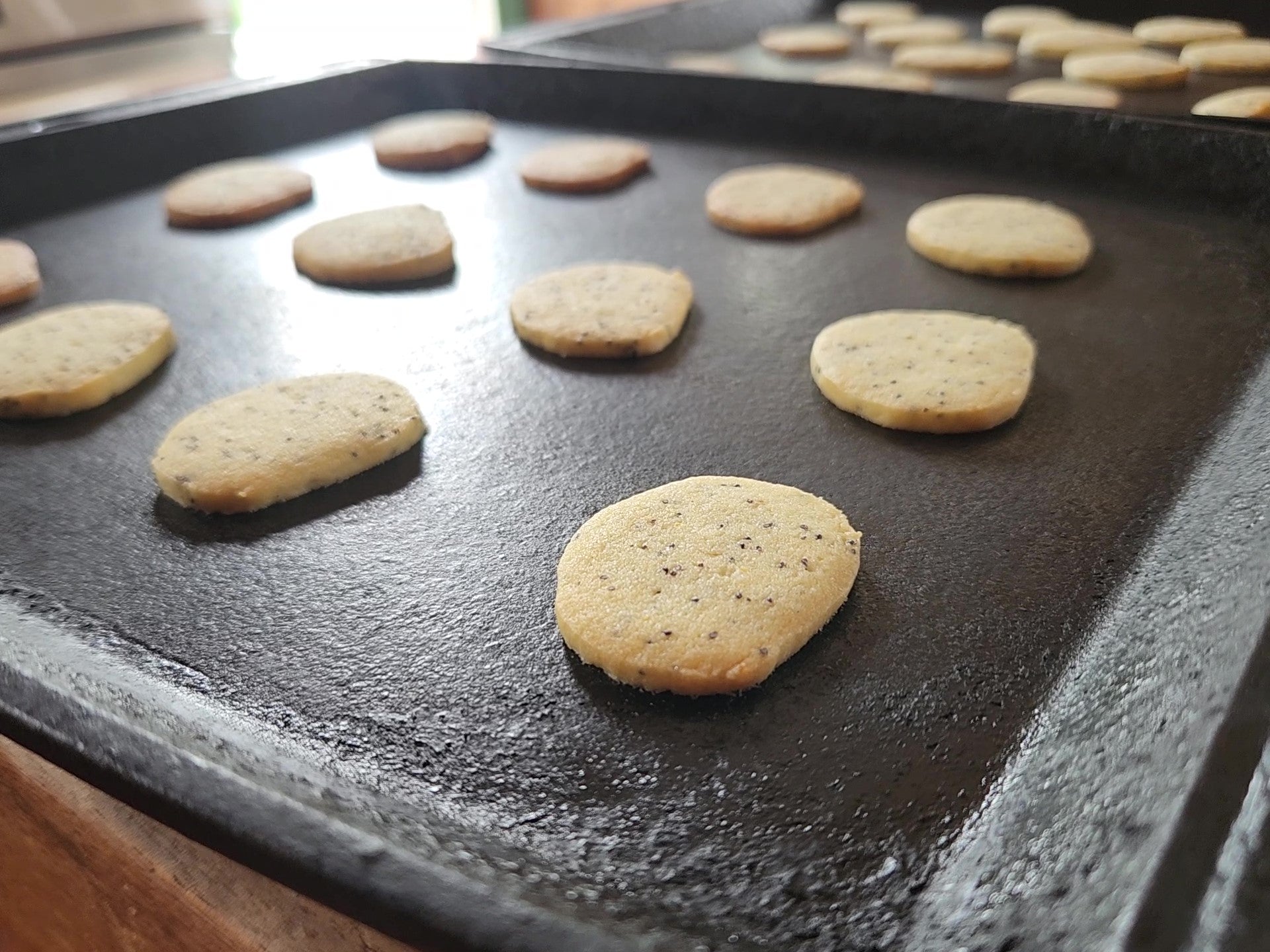 Rachael Zoe Miller's famous (to us) citrus and poppy seed cookies are the yummiest, most "moreish" cookies we've ever tasted. Made in a short-bread cookie style, these are perfect for crunchy, buttery cookie lovers and a hit favorite at the Vermont Farmer's Markets! And true to our goals of reducing exposure to plastic, they are made without coming in contact with plastic. We use metal or glass bowls, cast iron baking pans and wooden spoons.